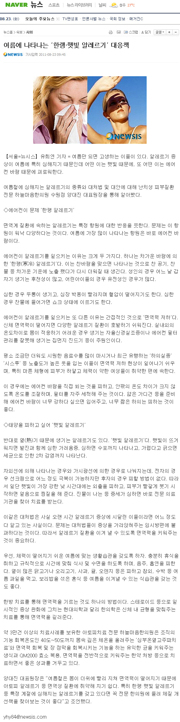 여름에 나타나는 ‘한랭·햇빛 알레르기’ 대응책