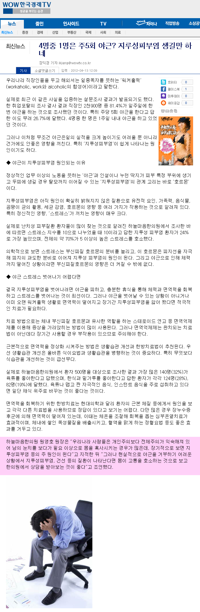 4명중 1명은 주5회 야근? 지루성피부염 생길만 하네