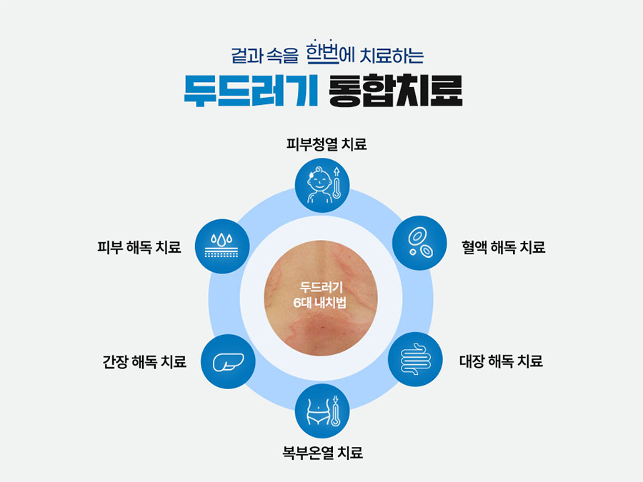 피부독소를 해독하는 피부 해독 치료 혈액 독소를 해독하는 혈액 해독 치료 간장 독소를 해독하는 간장 해독 치료 대장 독소를 해독하는 대장 해독 치료 피부의 열을 내리는 피부 청열 치료 복부의 온도를 높이는 복부 온열 치료를 통해 6가지를 복합적으로 치료하는 것을 두드러기 통합 치료라고 합니다.