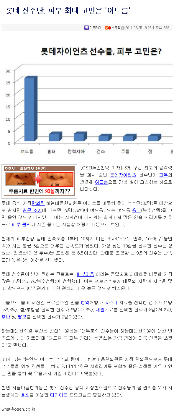 롯데 선수단, 피부 최대 고민은 '여드름'