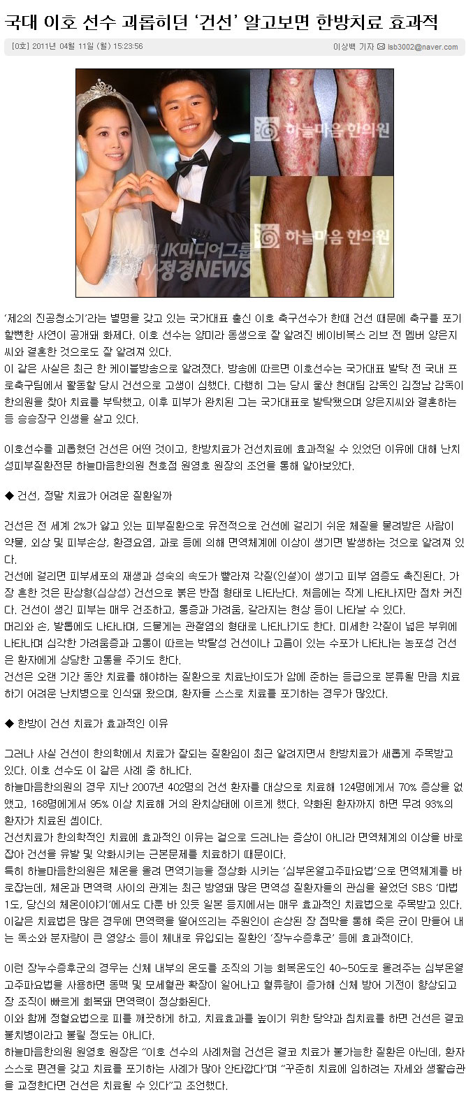 국대 이호 선수 괴롭히던 ‘건선’ 알고보면 한방치료 효과적