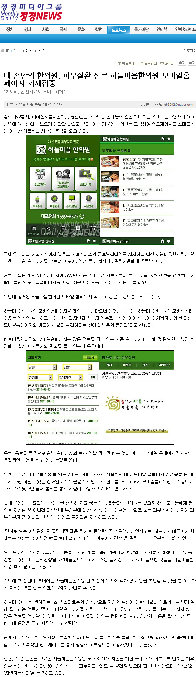 내 손안의 한의원, 피부질환 전문 하늘마음한의원 모바일홈페이지 화제집중