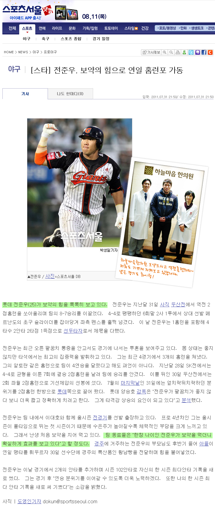 전준우, 하늘마음한의원 보약의 힘으로 연일 홈런포 가동
